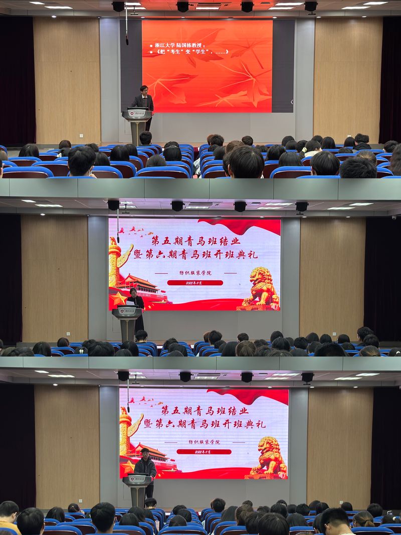 为落实学校“三全六专”工作要求,深入学习宣传贯彻党的二十大精神,11月4日晚,纺织服装学院第五期“青马工程”培训班结业暨第六期“青马工程”培训班开班于5教117举行。学院党委副书记梁雪松,院团委副书记陈倩以及第五期、六期青马班学员参加了本次典礼。典礼由陈倩主持。