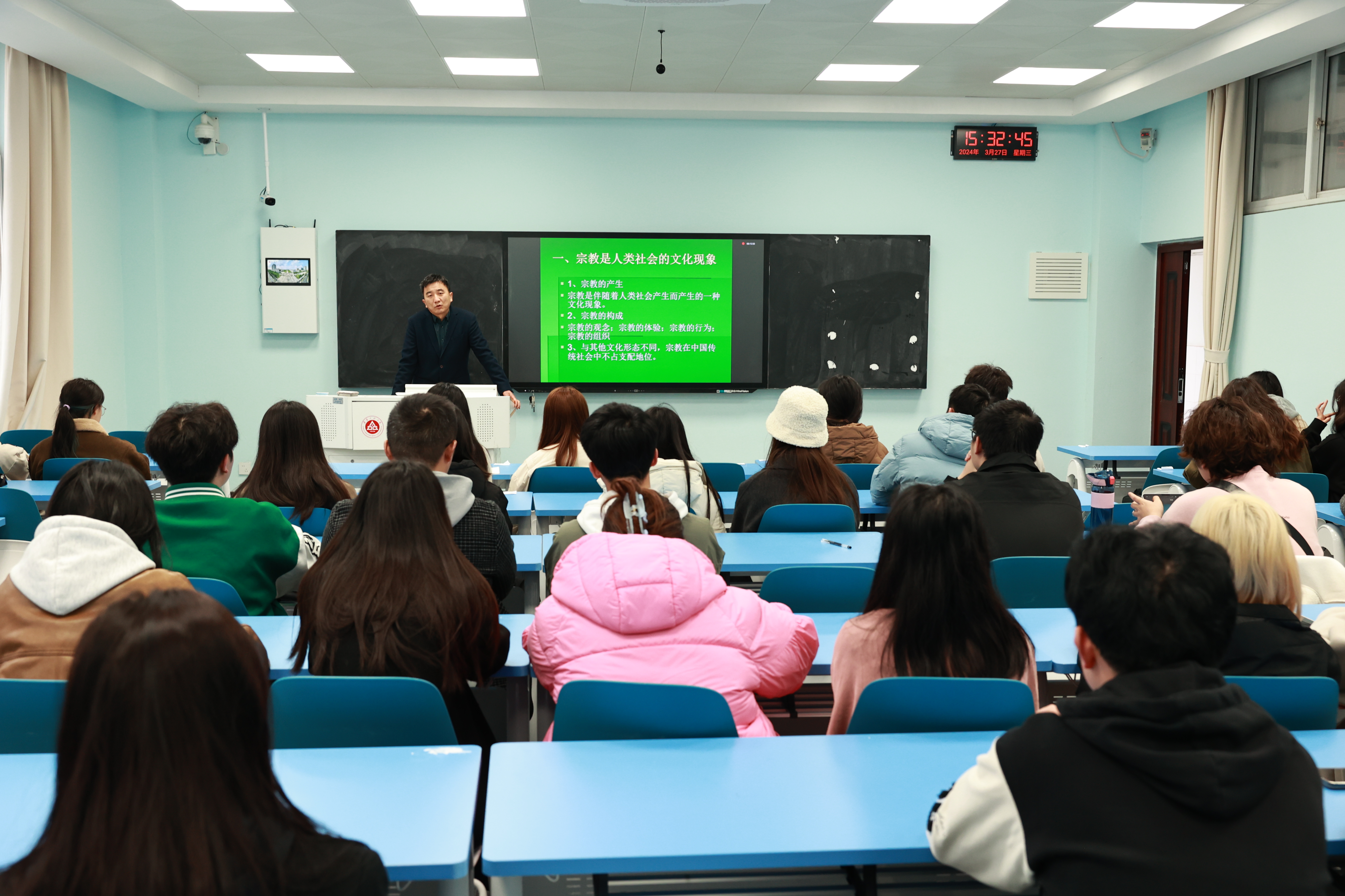 刘聪深入浅出的为学生们讲解了宗教的历史和马克思主义宗教观的形成与发展。他结合现实案例重点讲解了如何辨别合法宗教和邪教。他指出,同学们要坚定理想信念,坚持唯物主义世界观,用习近平新时代中国特色社会主义思想武装自己头脑,做一个有政治辨别能力的新时代大学生。