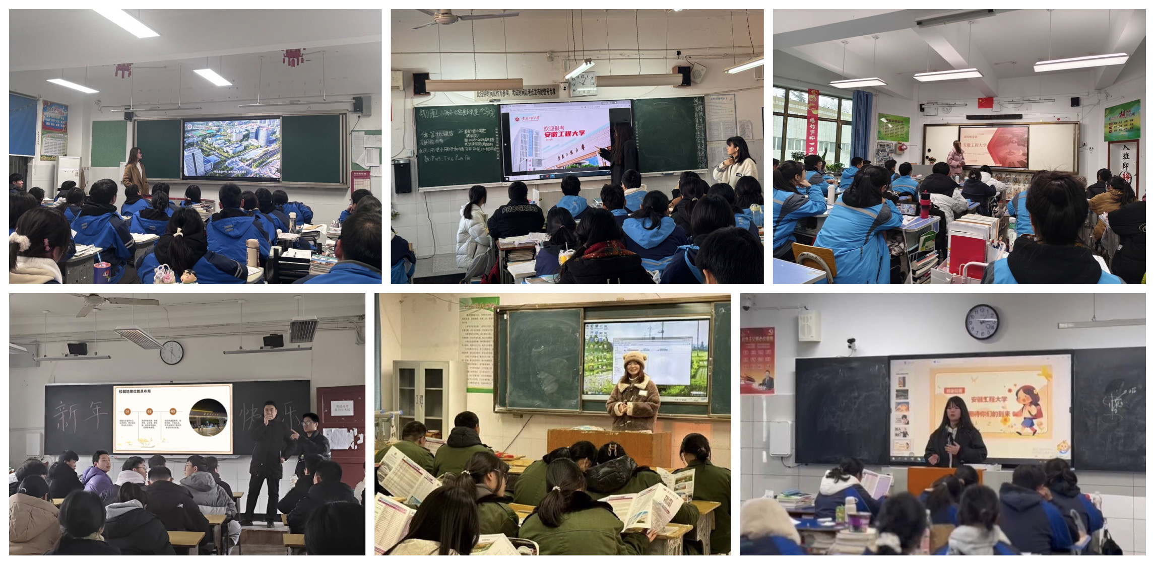 宣讲环节,各志愿团队根据宣讲PPT、视频和文件为母校学子们详细介绍了安工程的办学历史、招生政策、报考要求、学科专业特色、个性化人才培养等情况,分享自身考学经验和大学校园生活,并为学弟学妹们送上高考和新春祝福。