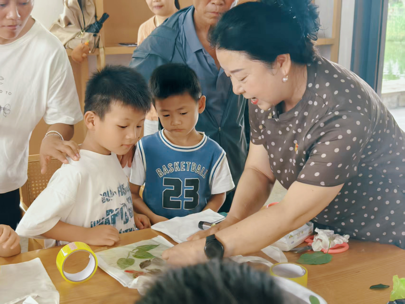 活动中,服装专业教师党支部邬红芳老师首先为现场的党员、志愿者和孩子们生动演示了捶草印花技艺。从植物选材、布局固定到敲击拓印,邬老师细致讲解每一个步骤要点,并着重强调操作安全规范,确保体验活动顺利开展。