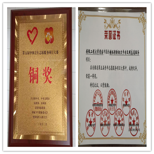 “美化乡村墙体彩绘”志愿服务活动荣获2020年志愿服务大赛国家级铜奖,安徽省一等奖。
